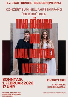 Die Kirchengemeinde lädt am Sonntag, 01. Februar 2026, um 17.00 Uhr zum Neujahrsempfang mit einem Konzert des Pianisten und Arrangeurs Timo Böcking und der Violinistin Anna Sophia Mutterer ein. Die Beiden waren bereits im Jahr 2024 mit einem phantastischen Konzert zu Gast in der Stadtkirche. Weitere Informationen zu den Künstlern finden Sie unter: www.timoboecking.de und www.anna-dorothea-mutterer.com.
