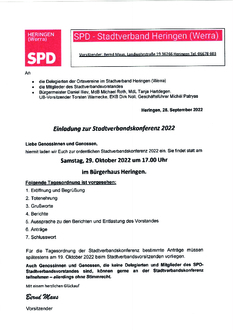 Der Vorstand des SPD-Stadtverbandes Heringen lädt die Delegierten der Ortsvereine zur Stadtverbandkonferenz 2022 am 29.10.2022 in das Bürgerhaus Heringen ein. Die Heringer Sozialdemokratinnen und Sozialdemokraten können auf ein erfolgreiches Jahr zurückblicken. Nach der erfolgreichen Wiederwahl von Bürgermeister Daniel Iliev, der dank eines engagierten Wahlkampfes ein fulminantes Ergebnis von knapp mehr als 85% einholte, folgt nun die Wahl zum Hessischen Landtag mit Tanja Hartdegen. Auch hier werden die Heringer Sozialdemokraten alles dafür geben, damit Tanja Hartdegen das Direktmandat erreicht.