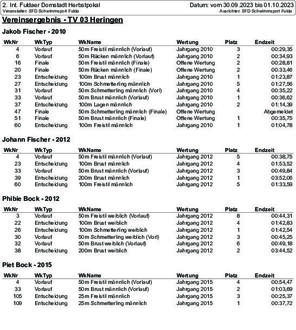 Beim 2. Fuldaer Herbstpokalschwimmen am 30.09.und 01.10. 2023 konnten die für den TV 03 Heringen startenden Geschwisterpaare Fischer und Bock insgesamt sieben Siege erzielen. Beim Wettkampf mit 18 Vereinen aus 5 Landesverbänden und insgesamt 1718 Starts konnten Sie sich immer im vorderen Feld behaupten. Bei 26 Starts schwammen Sie siebenmal auf Platz Eins, Sechs mal auf Platz Zwei und Vier mal auf Platz Drei.Auch eine Menge neuer Bestzeiten wurden erzielt. So konnte Jakob Fischer (Jg.2010) gleich achtmal seine bestehenden persönlichen Bestzeiten verbessern. Sein Bruder Johann Fischer schaffte es dreimal seine Bestzeiten nach unten zuschrauben. Phibie Bock ( Jg.2012 ) schaffte es dreimal neue Bestzeiten zu schwimmen, Bruder Piet Bock ( Jg.2015) konnte ebenfalls drei neue Bestzeiten schwimmen.