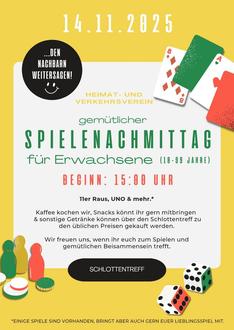 Am 14.11.2025 findet endlich wieder ein Spielenachmittag ab 15:00 Uhr im Schlottentreff statt.