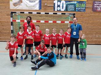 Die Spieler vom 4. Sieg in Folge (v. l.: Robert Cociu, Moritz Rimbach, Adrian Thornagel, Joshua Ewald, Leon Heyer, Maxim Sucrow, Eliah Eitzeroth, Hugo Helm und Henry Schneider sowie vorne: Torhüter Elias Schäfer)
