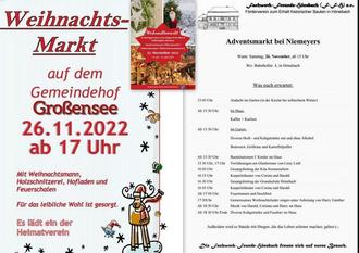 Samstag den 26. November ist ab 15 Uhr Adventsmarkt bei Niemeyers in Hönebach und ab 17 Uhr Weihnachtsmarkt auf dem Gemeindehof in Großensee.