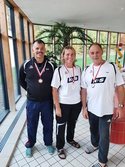 Bei den Bezirksmasters und Bezirksmeisterschaften Lange Strecken im heimischen Fritz-Kunze-Bad in Heringen am 15. Und 16. Oktober holten die Heringer Seniorenschwimmer einen kompletten Medaillensatz. Bei der gut organisierten Veranstaltung , für die sich der TV 03 nochmals herzlichst bedankt bei der Stadt und dem Bürgermeister als Schirmherr , für die Bereitstellung des Schwimmbades nebst Personal , erreichten die drei Heringer Aktiven bei 10 Starts sechs Siege und vier weitere Podestplätze . In der Dreierwertung gewann Manuela Dorfmann (AK 45 ) die Gold-, Eugen Keßler (AK 55 ) die Silber- und Daniel Diel (AK 55 ) die Bronzemedaille.