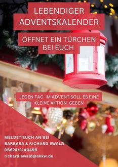 Wir laden wieder dazu ein, sich für den lebendigen Adventskalender anzumelden. An allen Wochentagen im Advent sollen sich Türchen öffnen. Wir wollen uns gegenseitig besuchen, gemeinsam Weihnachtslieder singen, basteln, Geschichten hören und vieles mehr. In diesem Jahr möchten wir die Termine und Orte auch im Mitteilungsblatt und auf den Verteilern der Stadtkirche veröffentlichen. Machen Sie mit und melden Sie sich an bei Richard & Barbara Ewald unter 06624/2140498 oder richard.ewald@ekkw.de.