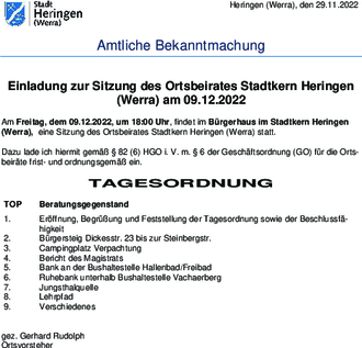 Am Freitag, dem 09.12.2022, um 18:00 Uhr, findet im Bürgerhaus im Stadtkern Heringen (Werra), eine Sitzung des Ortsbeirates Stadtkern Heringen (Werra) statt. Dazu lade ich hiermit gemäß § 82 (6) HGO i. V. m. § 6 der Geschäftsordnung (GO) für die Ortsbeiräte frist- und ordnungsgemäß ein.