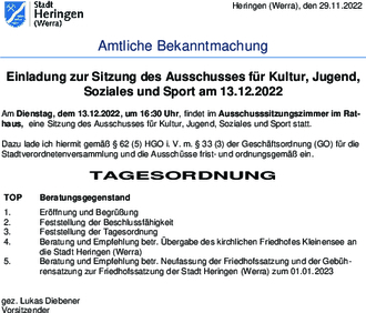 | 5. | Beratung und Empfehlung betr. Neufassung der Friedhofssatzung und der Gebührensatzung zur Friedhofssatzung der Stadt Heringen (Werra) zum 01.01.2023 |