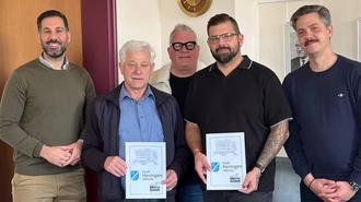 Auf dem Foto v.l.n.r.: Bürgermeister Daniel Iliev, Hans Joachim Deisenroth, Oberamtsrat Michael Ernst, Florian Krzywdzinski und Stadtrat Michèl Patryas.