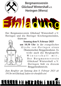 Traditionell wird in Heringen am 2. Sonntag im Februar die Kirchschicht gefeiert. In einer kleinen Bergparade werden um 10 Uhr hinter der Bergkapelle Wintershall und unserem Verein Gäste aus Hessen, Thüringen und Sachsen in Bergmannstracht von der Aula der Werratalschule zur evangelischen Stadtkirche marschieren. Nach dem ökumenischen Berggottesdienst erfolgt der Rückmarsch der Parade zur Aula, um dort, unter den Klängen der Bergkapelle, das Tzscherperfrühstück einzunehmen. Der Bergmannsverein Glückauf Wintershall Heringen (Werra) freut sich auf zahlreiche Besucher!