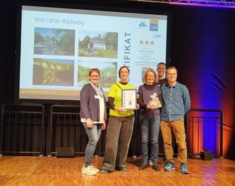 Drei Sterne für den Werratal-Radweg kann und sollte die Werratal Touristik e. V. nun gebührend feiern, darin waren sich Geschäftsführerin Heidi Brandt und ihr Kollege Jörg Peters, Tourismusverantwortlicher im Landkreis Hersfeld-Rotenburg, der zur Urkundenübergabe am 20.01.2025 mit zur CMT nach Stuttgart gereist war, einig. Beide werden aber auch im Verbandsvorstand dafür plädieren, das Vier-Sterne-Ziel bis zur Reklassifizierung 2027 wieder ins Auge zu fassen. Schließlich lautete die Ermutigung des ADFC-Prüfers: „Durch die sehr guten Bewertungen in fünf Kategorien steht dem Werratal-Radweg die Möglichkeit offen, mittel- oder langfristig eine 4 Sterne Klassifizierung zu erreichen.“