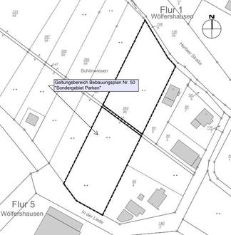 hier: räumlicher Geltungsbereich B-Plan Nr. 50 „Sondergebiet Parken“, ST Wölfershausen, Plan genordet, ohne Maßstab