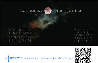 Mit Bildern, kurzen Texten und Anregungen für ein kleinen Ritual begleiten wir dich vom 27. Dezember bis zum 1. Januar durch diese besondere Zeit „zwischen den Jahren“. Unsere Impulse werden dich kurz vor der Abenddämmerung erreichen und laden dich ein, die kommende Nacht aus einer bestimmten Perspektive anzuschauen und zu erleben. Wenn du magst gestalte dir einen passenden Rahmen: Koch dir einen Tee, zünde eine Kerze an, richte dein Inneres aus durch ein Gebet oder eine Meditation, werde still, komm bei dir selbst an. Du findest uns ab 27. Dezember dann auf Facebook, Instagramm und YouTube. Lass dich mit uns gemeinsam ein – auf die Zeit zwischen den Jahren.