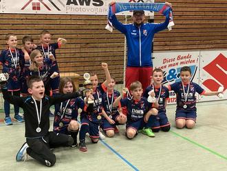 hinten: Mats Walch, Theodor Korth, Kilian Rabe, Maja Walch, Trainer Tobias Güntsch | vorn: Leonard Baumgardt [TW], Emil Schäfer, Finn Schäfer, Finn Güntsch, Patrick-Sebastian Cociu, Eliah Walz, David Alexandru Georgescu