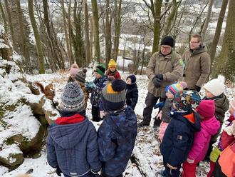 Seit Januar 2023 sind wir, die Kinder der Gruppe 3, der kath. Kita St. Bartholomäus den Waldtieren auf der Spur. Als kleine Waldtierforscher entdecken wir gemeinsam mit unserer Handpuppe, dem Förster Fabi die heimischen Waldtiere. In den letzten Wochen sind Emil Eichhörnchen, Feli Fuchs, Willi Wildschwein und Ronja Reh in unseren Gruppenraum eingezogen. In dieser Zeit haben wir viel im Wald entdeckt, erforscht, und über die Tiere gelernt. Auch konnten wir die Ranger des Biosphärenreservates Rhön einen Vormittag im Wald begleiten. Im Rahmen eines Familiennachmittages im Wildpark Gersfeld schauten wir uns die Tiere aus nächster Nähe an. Unser naturbezogenes Projekt steht ganz unter dem Thema „Wir sind Teil der Schöpfung - darum lasst uns auf sie achten!“. Die Kinder konnten einen respektvollen und wertschätzenden Umgang mit dem Lebensraum Wald und seinen Lebewesen erfahren. Diese Woche verabschieden wir uns von unserem Förster Fabi und die Kinder werden als Waldtierforscher ausgezeichnet. Das war eine spannende und erlebnisreiche Projektzeit!