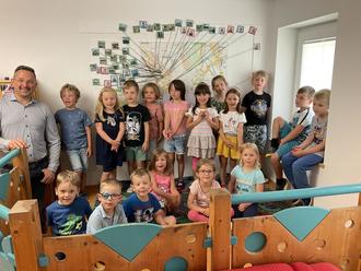 Die Kinder der Gruppe 2 der kath. Kindertagesstätte St. Bartholomäus Hilders haben ihr Jahresprojekt „Wir entdecken unsere Gemeinde“ abgeschlossen. Sie besuchten interessante Orte in Hilders. Dazu zählten die Kirchen, das Rathaus mit Besuch des Bürgermeisters, den ansässigen Hausarzt, die Apotheke, die Pizzeria und die Eisdiele, die Polizeistation, die Spielplätze usw.. Außerdem durften alle Kinder der Gruppe ihr Zuhause zeigen und waren sehr stolz darauf. Dafür fuhren sie mit dem Bus oder wanderten auch in die Ortsteile der Gemeinde Hilders. Dabei hatten sie große Freude. Zum Abschluss dieser erlebnisreichen Aktionen durften die Eltern und Großeltern zum gemeinsamen Frühstück in den Kindergarten kommen. Anschließend präsentierten die Kinder anhand eines großen Wandbildes ihre Erlebnisse und Erfahrungen. Auch Bürgermeister Ronny Günkel war eingeladen. Er schenkte den Kindern ein Pixiheft mit dem Titel „Was macht meine Gemeinde? Unterwegs mit dem Bürgermeister“.