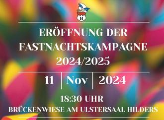Am 11.11.2024 um 18:30 Uhr am Hilderser Ulstersaal (Brückenwiese) (NEU) ist es wieder so weit, die HFG startet mit elf traditionellen Böllerschüssen in die fünfte Jahreszeit. Im Anschluss erfolgt die Inthronisierung der neuen Prinzenmannschaft im Ulstersaal. Hierzu sind alle Narren herzlich eingeladen.