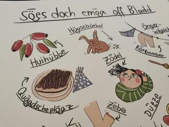 Darauf findet man, neben anschaulichen Bildern auch die passenden Begriffe, die sich witzig und schön anhören Unter ihnen befinden sich nicht nur typische Beispiele für die Lautstruktur des Rhöner Platts, sondern auch in hohem Maße einmalige Begriffe des Dialekts wie “Huihübbe” und “Zorngüggel”.