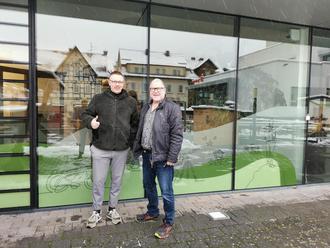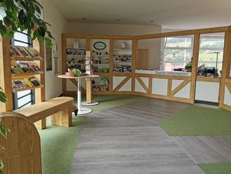 Im März haben bereits die Schreinerei Meliton und die Zimmerei Fink aus Hilders die Fachwerkwand eingebaut. Das Bürgerbüro kann nun bei Bedarf durch Glastüren verschlossen werden. Es folgte ein neuer Bodenbelag, der dem Schwarzen Moor mit Bohlenpfad nachempfunden ist (danke an Markus Keerl für die Verlegung). Gestern wurde noch das Schaufenster unter eisigen Bedingungen durch das Werbewerk Hilders sowie Werbetechnik Leibold aus Hilders beklebt.