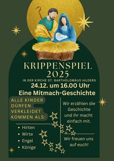 16:00 Uhr, Krippenspiel – eine Mitmachgeschichte – Alle Kinder dürfen verkleidet kommen als Engel, Hirte, Wirt oder König und können mitmachen.