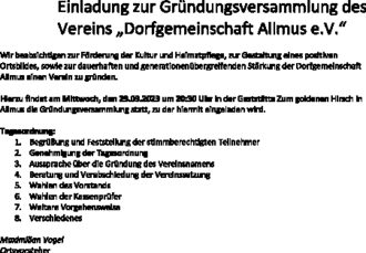 Hierzu findet am Mittwoch, den 29.03.2023 um 20:30 Uhr in der Gaststätte Zum goldenen Hirsch in Allmus die Gründungsversammlung statt, zu der hiermit eingeladen wird.