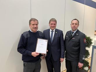 Dr. Michael Karges (von links nach rechts) erhält den Ehrenbrief des Landes Hessen von Bürgermeister Markus Röder und dem Hofbieberer Gemeindebrandinspektor Heiko Kremer Bildquelle: Gemeindeverwaltung Hofbieber