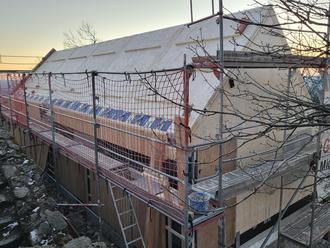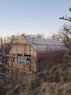 Nach Beendigung der Winterpause sind die Arbeiten an der Milseburghütte wieder im vollen Gange. Zehn Mitarbeiter der Firmen Meister aus Dieburg und Baumgarten aus Ebersburg sind seit Montag dabei, die Holzelemente der Außen- und Innenwände des Erdgeschosses anzubringen.
