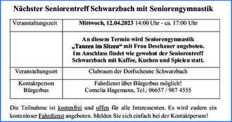 Nächster Seniorentreff Schwarzbach mit Seniorengymnastik