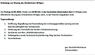 Am Freitag 12.05.2023, findet um 20:00 Uhr in der Gaststätte (Backstube) Herr in Wittges eine öffentliche Sitzung des Ortsbeirates Wittges statt, zu der hiermit eingeladen wird.
