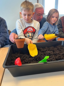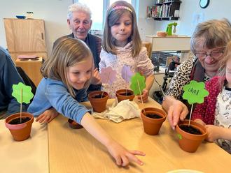 Die Nähe beider Einrichtungen zueinander sollte schon längst für gemeinsame Aktivitäten genutzt werden und so war es im März endlich soweit. Einige der Senioren kamen rüber zu uns und wir verbrachten den Vormittag im Löwenraum. Es wurden gemeinsame Töpfchen mit verschiedensten Blumensamen ausgesät über die sich besonders die Schmetterlinge freuen werden. Im Anschluss daran bastelte jeder der Senioren und der Kinder ein Namensschild in Form einer Blume für ihr eigenes Töpfchen. Da uns das aber noch zu langweilig aussah, haben alle die Ärmel hochgekrempelt und sich in die Fingerfarbe gestürzt.