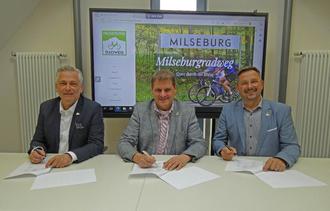 Der Milseburgradweg wird von den Gemeinden Hilders, Hofbieber und Petersberg seit nunmehr 20 Jahren unterhalten und bewirtschaftet. Die kommunale Zusammenarbeit der Gemeinden ist als sehr gelungen einzustufen und ist etabliert. In der letzten Sitzung der Arbeitsgemeinschaft Milseburgradweg konnte nun die neue Vereinbarung über die Bildung einer kommunalen Arbeitsgemeinschaft von den drei Bürgermeistern Carsten Froß (Petersberg), Markus Röder (Hofbieber) und Ronny Günkel (Hilders) unterzeichnet werden. Die ursprüngliche Vereinbarung war zu Beginn des Jahres ausgelaufen. Deshalb war es erforderlich diese zu überarbeiten und den heutigen Gegebenheiten anzupassen. Die Arbeitsgemeinschaft wird somit den beliebten und über die Grenzen des Landkreises hinaus bekannten Radweg gemeinsam für weitere 5 Jahre für Zwecke des Rad- und Fußgängerverkehrs unterhalten, bewirtschaften und touristisch vermarkten.