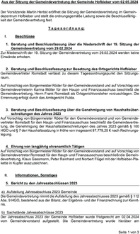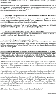 Der Jahresabschluss 2023 der Gemeinde Hofbieber wurde fristgerecht am 02.04.2024 vom Gemeindevorstand aufgestellt. Die Gemeindevertretung wurde hierüber am 02.05.2024 unterrichtet. Bereits seit dem 08.04.2024 prüft die Revision den gemeindlichen Jahresabschluss.