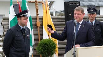 Pfarrer Andreas Matthäi segnet das neue Feuerwehrfahrzeug, rechts: Landrat Bernd Woide
