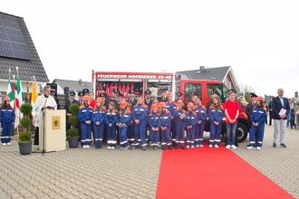 Bürgermeister Markus Röder übergab symbolisch den Fahrzeugschlüssel an den Gemeindebrandinspektor Heiko Kremer und dieser gab ihn weiter an Wehrführer Marco Muth. Pfarrer Andreas Matthäi segnete das neue Feuerwehrfahrzeug.