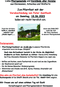 | Kleinsassen | 14:00 Uhr | Pfarrfestgottesdienst mit Verabschiedung von Pater Santhosh |