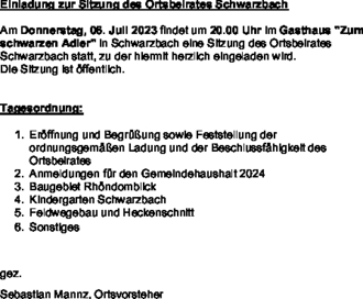 Am Donnerstag, 06. Juli 2023 findet um 20.00 Uhr im Gasthaus "Zum schwarzen Adler" in Schwarzbach eine Sitzung des Ortsbeirates Schwarzbach statt, zu der hiermit herzlich eingeladen wird.