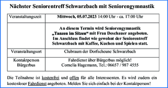 | An diesem Termin wird Seniorengymnastik „Tanzen im Sitzen“ mit Frau Deschauer angeboten. Im Anschluss findet wie gewohnt der Seniorentreff Schwarzbach mit Kaffee, Kuchen und Spielen statt. |