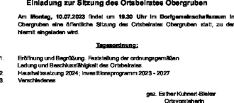 Am Montag, 10.07.2023 findet um 19.30 Uhr im Dorfgemeinschaftsraum in Obergruben eine öffentliche Sitzung des Ortsbeirates Obergruben statt, zu der hiermit eingeladen wird.