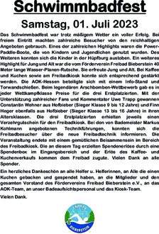 Ein herzliches Dankeschön an alle Helfer u. Helferinnen, an Alle die einen Kuchen gebacken und gespendet haben, an die Mitglieder und den gesamten Vorstand des Fördervereins Freibad Bieberstein e.V., an das AOK-Team, an unser Badeaufsichtspersonal und das Kiosk-Team.