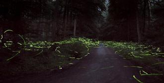 Der Flug der männlichen Glühwürmchen auf einem Waldweg während der Brautschau (Collage mehrerer Langzeitbelichtungen). Foto: Carl Herzog