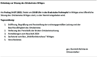 Am Freitag 14.07.2023, findet um 20:00 Uhr in der Backstube Frohnapfel in Wittges eine öffentliche Sitzung des Ortsbeirates Wittges statt, zu der hiermit eingeladen wird.