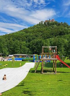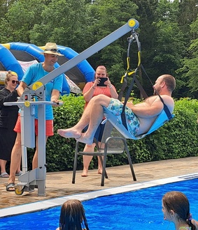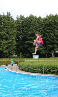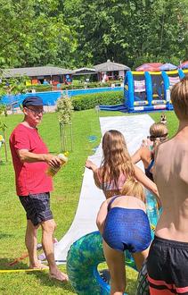 Anschließend begann das Schwimmbadfest. Bei freiem Eintritt machten zahlreiche Besucher von den reichhaltigen Angeboten gebrauch. Eines der zahlreichen Highlights waren die Power-Paddle-Boote, die von Kindern und Jugendlichen genutzt wurden. Des Weiteren konnten sich die Kinder in der Hüpfburg austoben. Ein weiteres Highlight für Jung und Alt war die vom Förderverein Freibad Bieberstein 40 Meter lange Wasser-Planen-Rutsche. Sie erfreute Jung und Alt. Bei Kaffee und Kuchen sowie am Freibadkiosk konnte sich entsprechend gestärkt werden. Der Verlag Parzeller beteiligte sich mit einem Info-Stand und Glückraddrehen. Beim legendären Arschbomben-Wettbewerb gab es in jeder Wettkampfklasse Preise für die drei Erstplatzierten. Mit der Unterstützung zahlreicher Fans und Kommentator Christoph Bellinger gewannen Elias Seng aus Elters (Sieger Klasse 9 bis 12 Jahre) und Leonard Hohmann aus Kleinsassen (Sieger Klasse 13 bis 16 Jahre) in ihren Altersklassen. Die drei Erstplatzierten erhielten jeweils einen Verzehrgutschein für den Freibadkiosk. Bei der von Bademeister Markus Kohlmann durchgeführten Vorführung des Freibadlifts für Personen mit Handicap, bekamen die Freibadbesucher einen Überblick über die Funktion und Nutzung des Lifts. Die Veranstaltung endete mit einem gemütlichen Beisammensein im Bereich des Freibadkiosk. Die an diesem Tag erzielten Spendenerlöse durch eine Spendenbox im Eingangsbereich und der Erlös des Kaffee- und Kuchenverkaufs kommen dem Freibad zugute. Vielen Dank an alle Spender.