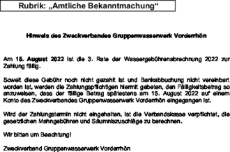 Soweit diese Gebühr noch nicht gezahlt ist und Bankabbuchung nicht vereinbart worden ist, werden die Zahlungspflichtigen hiermit gebeten, den Fälligkeitsbetrag so anzuweisen, dass der fällige Betrag spätestens am 15. August 2022 auf einem Konto des Zweckverbandes Gruppenwasserwerk Vorderrhön eingegangen ist.