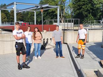 v.l.n.r. Auszubildender Quin Schäfer (Fachkraft für Wasserversorgungstechnik), Auszubildende Svenja Büttner (Verwaltungsfachangestellte), Praktikantin Josefin Daines, Auszubildender Raffael Grosch (Verwaltungsfachangestellter), 2. Klärwärter Julian Hornung