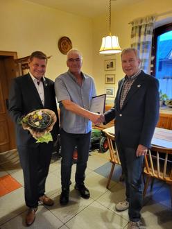 Hubertus Vilmar (Mitte) erhält den Ehrenbrief des Landes Hessen von Bürgermeister Markus Röder (links) und von dem Vorsitzender der Gemeindevertretung Martin Herbst (rechts) Bildquelle: Gemeindeverwaltung Hofbieber
