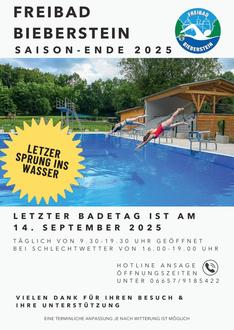 Die diesjährige Badesaison im Freibad Bieberstein neigt sich dem Ende zu. Voraussichtlich wird Sonntag, der 14. September 2025 der letzte Badetag sein – je nach Wetterlage kann sich dieser Termin jedoch noch verschieben.