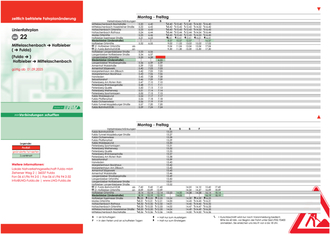 aufgrund der Baumaßnahme zwischen Niederbieber und Hofbieber in Verbindung mit der bereits bestehenden Baumaßnahme zwischen Niederbieber und Margretenhaun kann der Ortsteil Niederbieber ab 01.09.2025 nur noch stark eingeschränkt bedient werden. Die Linie 22 wird hierfür auf einzelnen Fahrten über Niederbieber (Ersatzhaltestelle in der Lindenstraße) geführt. In Hofbieber (Haltestelle „Hofbieber Ortsmitte“) muss auf die Linie 21 aus/in Richtung Fulda umgestiegen werden.