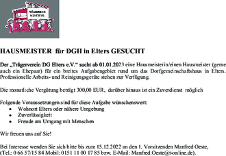 Der „Trägerverein DG Elters e.V.“ sucht ab 01.01.2023 eine Hausmeisterin/einen Hausmeister (gerne auch ein Ehepaar) für ein breites Aufgabengebiet rund um das Dorfgemeinschaftshaus in Elters.
