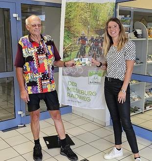 Hans-Jürgen Larbig und Claire Klinkert (Tourist-Information Hofbieber) bei der Gewinnübergabe