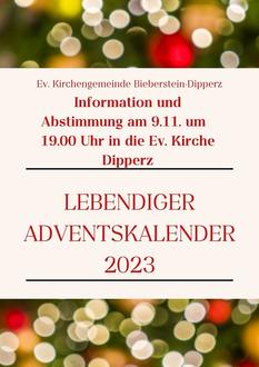 In diesem Jahr haben wir als Gemeinde wieder ganz besondere Gottesdienste und Aktivitäten im Advent und zur Weihnachtszeit in der Planung und führen diese auch durch. Wir werden wieder einen lebendigen Adventskalender in der Adventszeit durchführen. Vom 1.12-24.12. wird der Ök. lebendige Adventskalender stattfinden. Dazu brauchen wir Menschen aus den Gemeinden Hofbieber und Dipperz die jeweils ab 18.00 Uhr als GastgeberInnen ein „Türchen“ gestalten. Komm gern zu unserer Informationsveranstaltung am 9.11. um 19.00 Uhr.