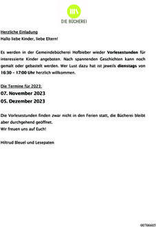 Es werden in der Gemeindebücherei Hofbieber wieder Vorlesestunden für interessierte Kinder angeboten. Nach spannenden Geschichten kann noch gemalt oder gebastelt werden. Wer Lust dazu hat ist jeweils dienstags von 16:30 – 17:00 Uhr herzlich willkommen.