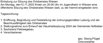 Am Montag, den 13.11.2023 findet um 20.00 Uhr im Jugendheim in Wiesen eine öffentliche Sitzung des Ortsbeirates Wiesen statt, zu der hiermit eingeladen wird.